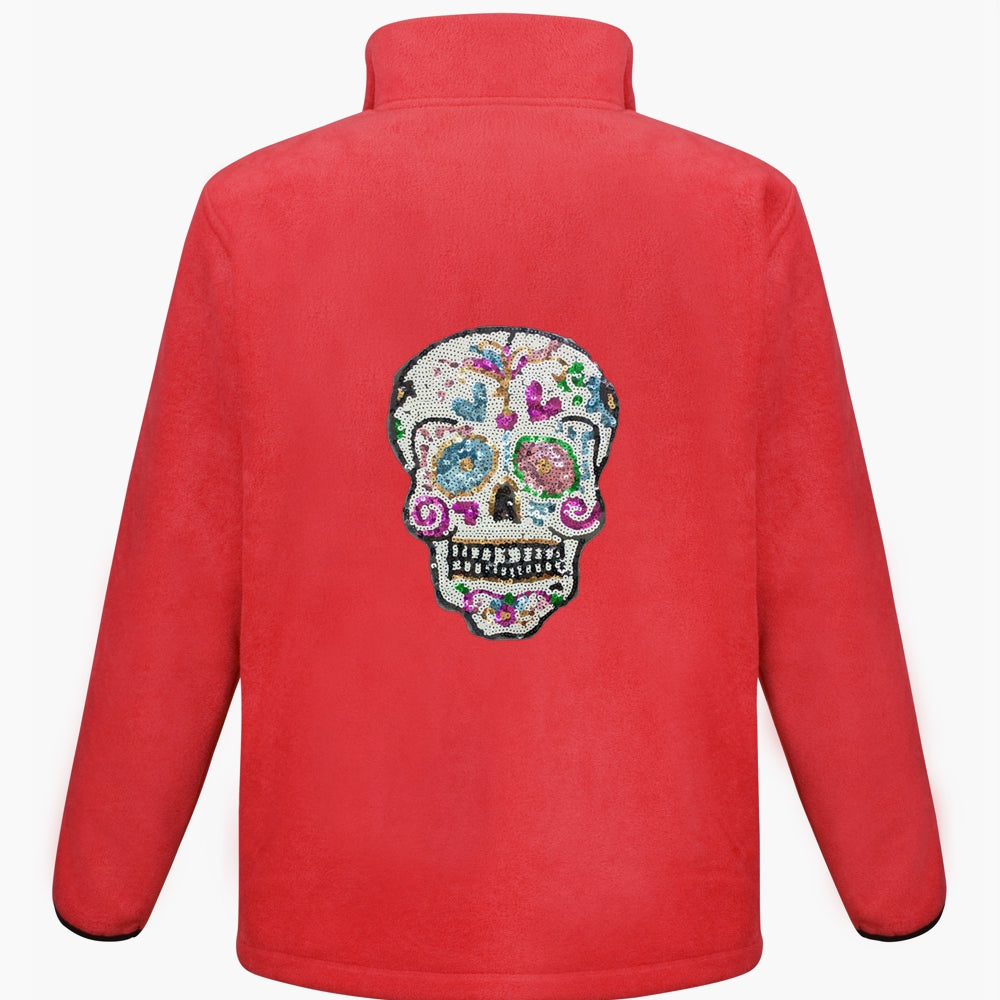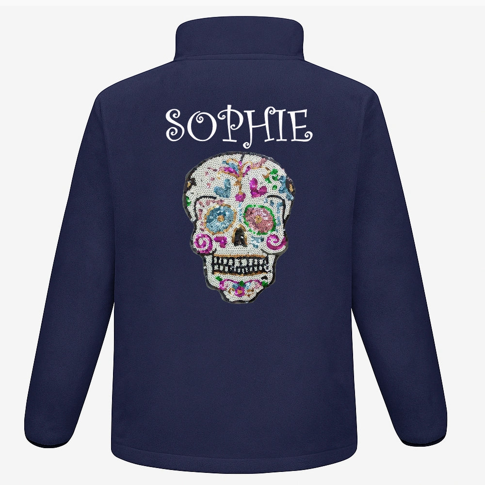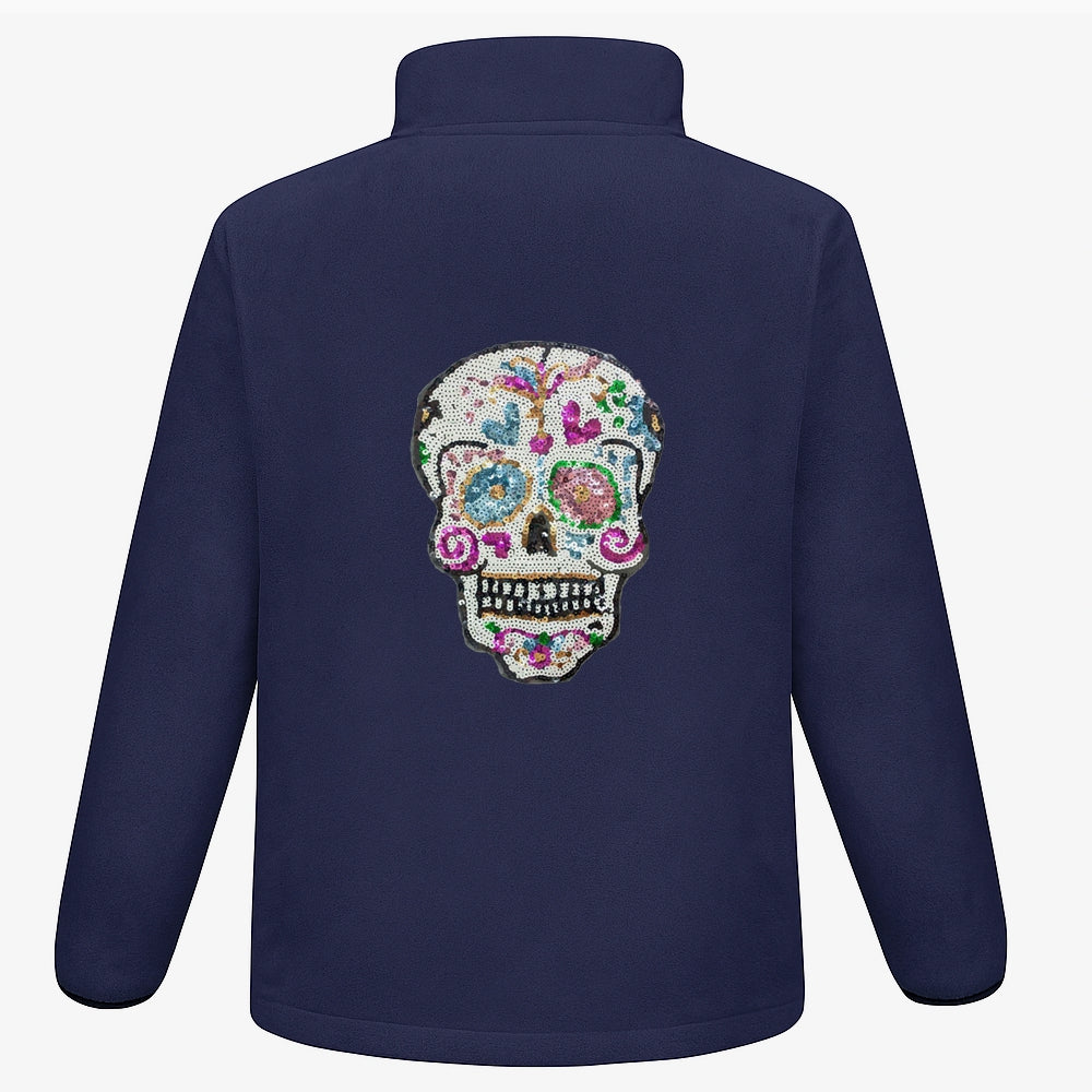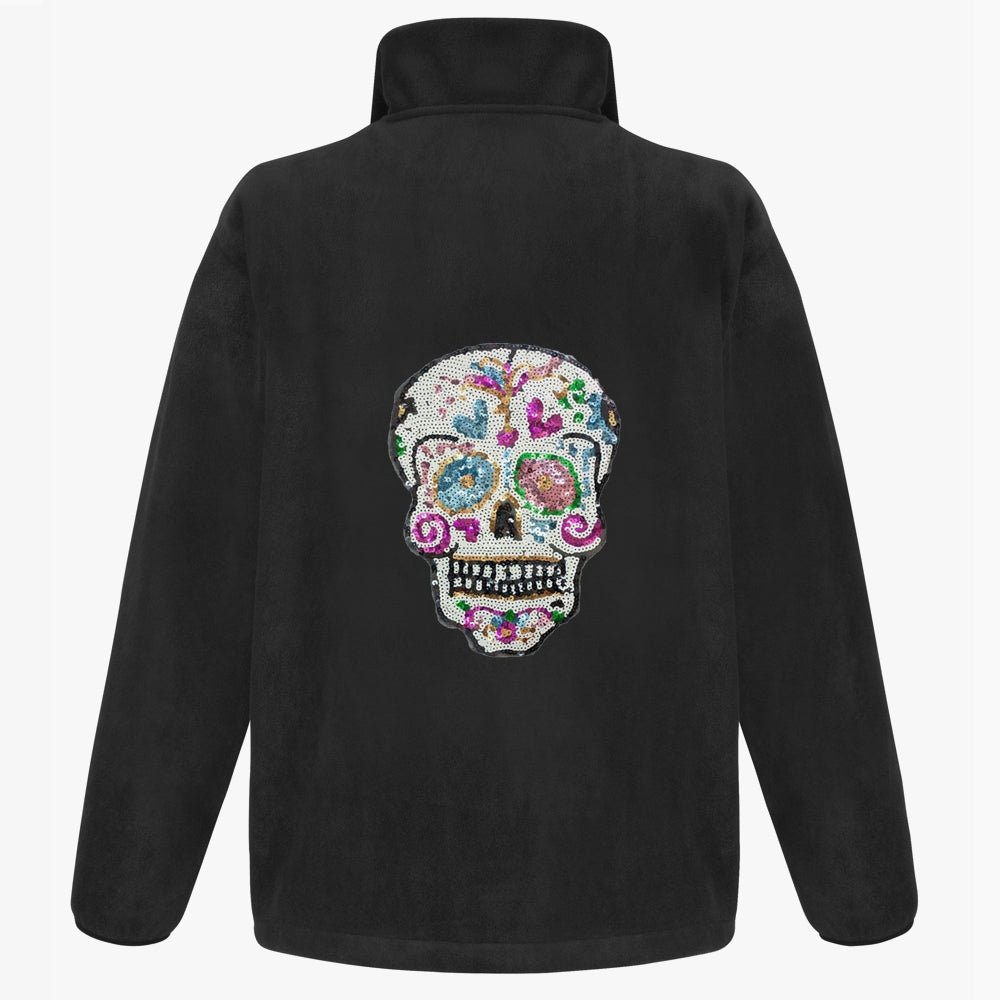 Super warm and cosy fleece customised with a large sequin candy skull, measuring an impressive 28cm in height.
