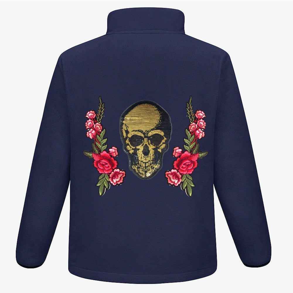 Super warm and cosy fleece customised with a gold sequin skull and contrasting embroidered roses.