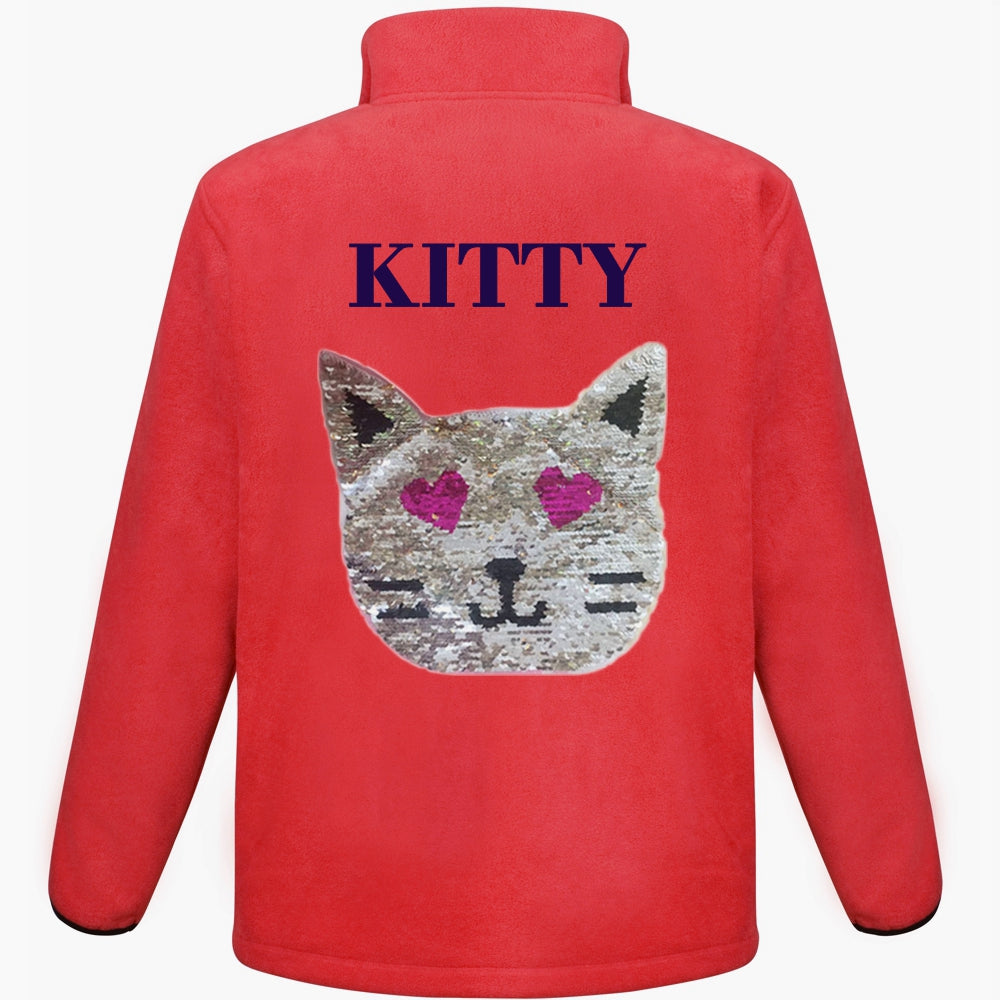 Super warm and cosy fleece customised with a fun cat with reversible sequins - gold one way and silver the other. The cat measures approx 20cm square.
