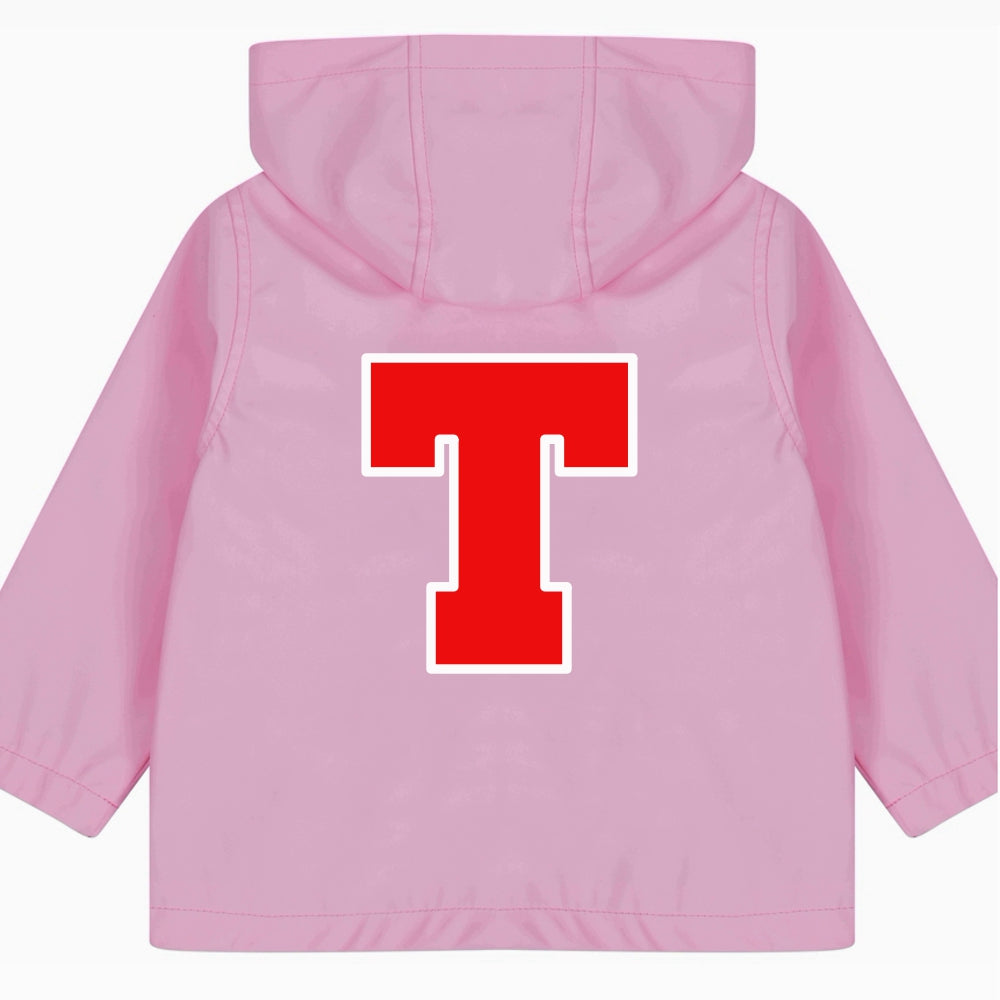 Bright, practical and made to last – this waterproof rain jacket keeps little explorers dry and happy, whatever the weather. Each one is customised to order with a HUGE initial in red or blue velvet applique, stitched to give the edging colour of your choice - red, green, white or blue.