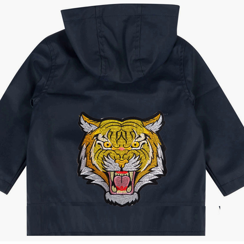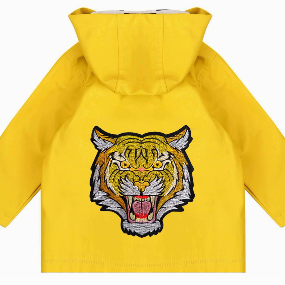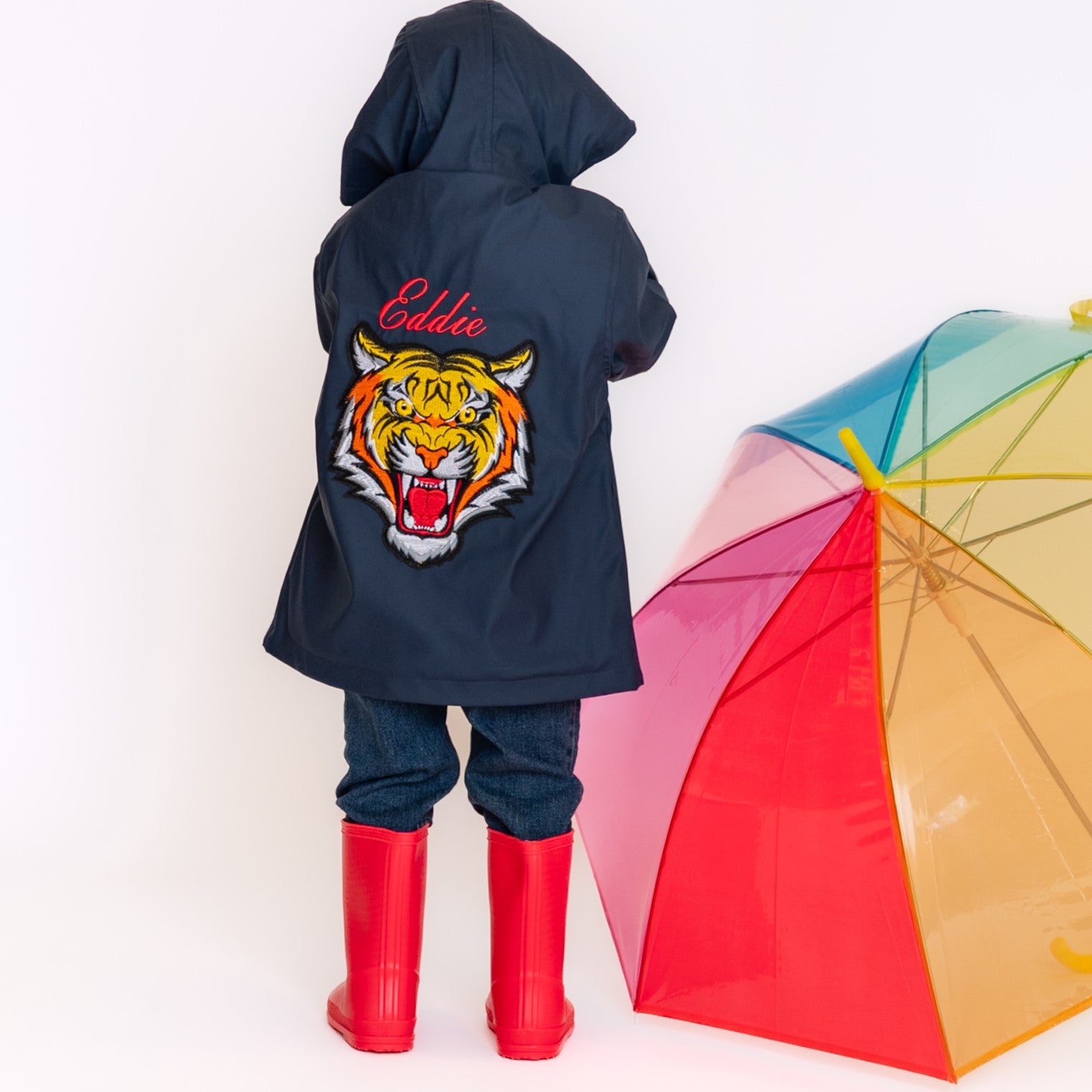 Bright, practical and made to last – this waterproof rain jacket keeps little explorers dry and happy, whatever the weather. Each one is customised to order with embroidered roaring tiger's head measuring 18cm across and the option to personalise by adding an embroidered name or initals. Choose your font and thread colour to create a totally personalised rain jacket!